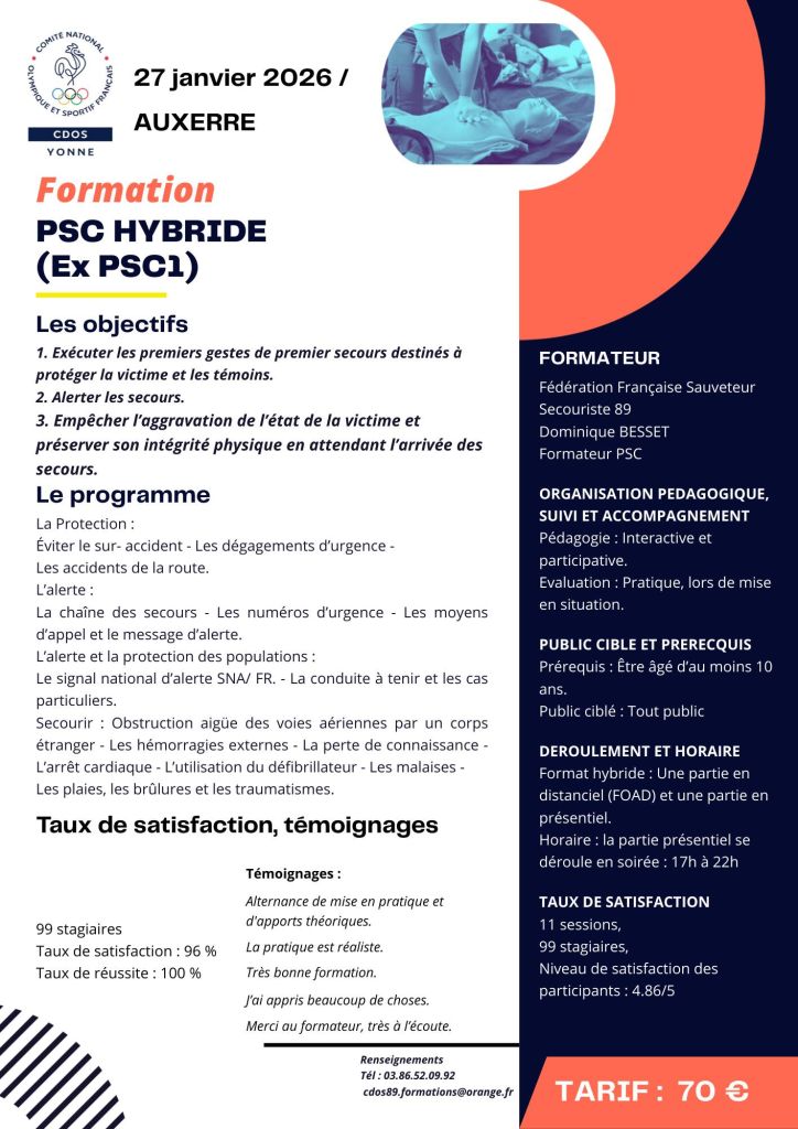 Le CDOS Yonne vous propose une formation PSC Hybride (Ex-PSC1), un format flexible spécialement conçu pour les actifs et les bénévoles engagés qui souhaitent apprendre les gestes qui sauvent sans sacrifier leur semaine.